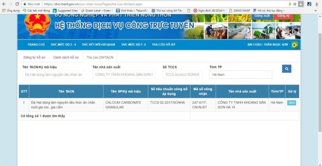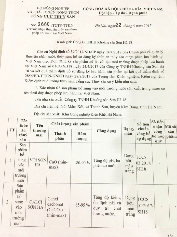 - Với lợi thế về nhà máy sản xuất và các sản phẩm đạt chất lượng cao, tháng 9/2017, sản phẩm Calci Sơn Hà và Vôi Sơn Hà đã được Tổng cục thủy sản cấp phép cho sử dụng trong ngành nuôi trồng thủy sản theo công văn số 2660/TCTS-TTKN ngày 22/09/2017.